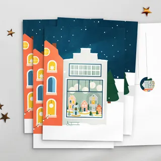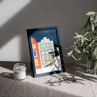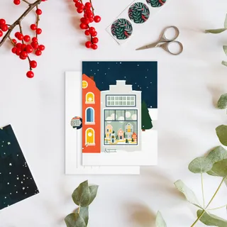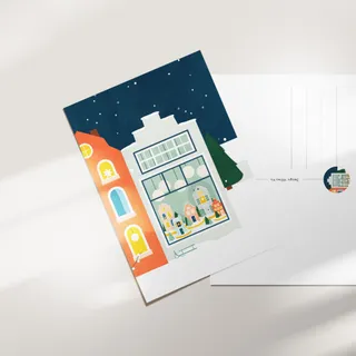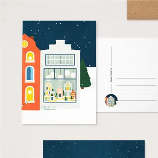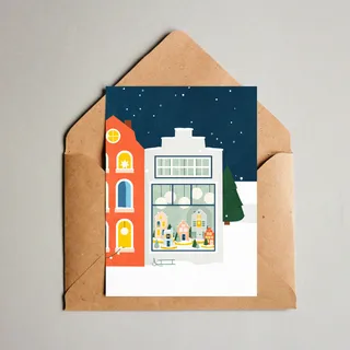 Kleurrijke winterse kaart met een charmant grachtenpandje vol feestelijke details. Deze gezellige illustratie brengt direct sfeer in huis en is perfect als kerstkaart of wanddecoratie tijdens de feestdagen. Ontdek telkens weer nieuwe details in het ontwerp, zoals de miniatuurhuisjes en dennenbomen achter het etalageraam.