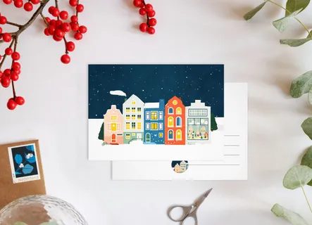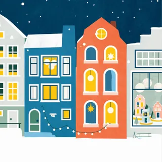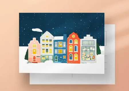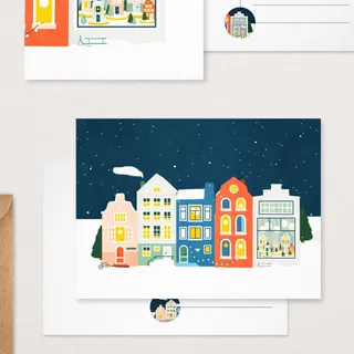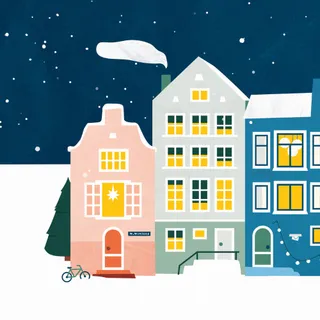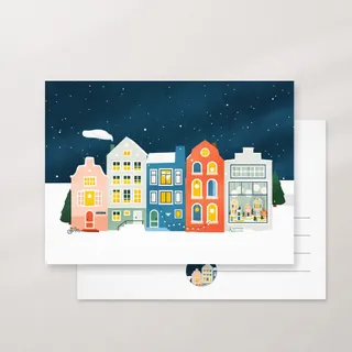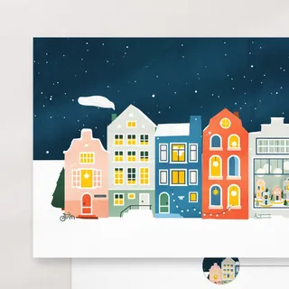 Gezellige kaart met besneeuwde grachtenpandjes straat. Hoe langer je kijkt, hoe meer details je ontdekt.
