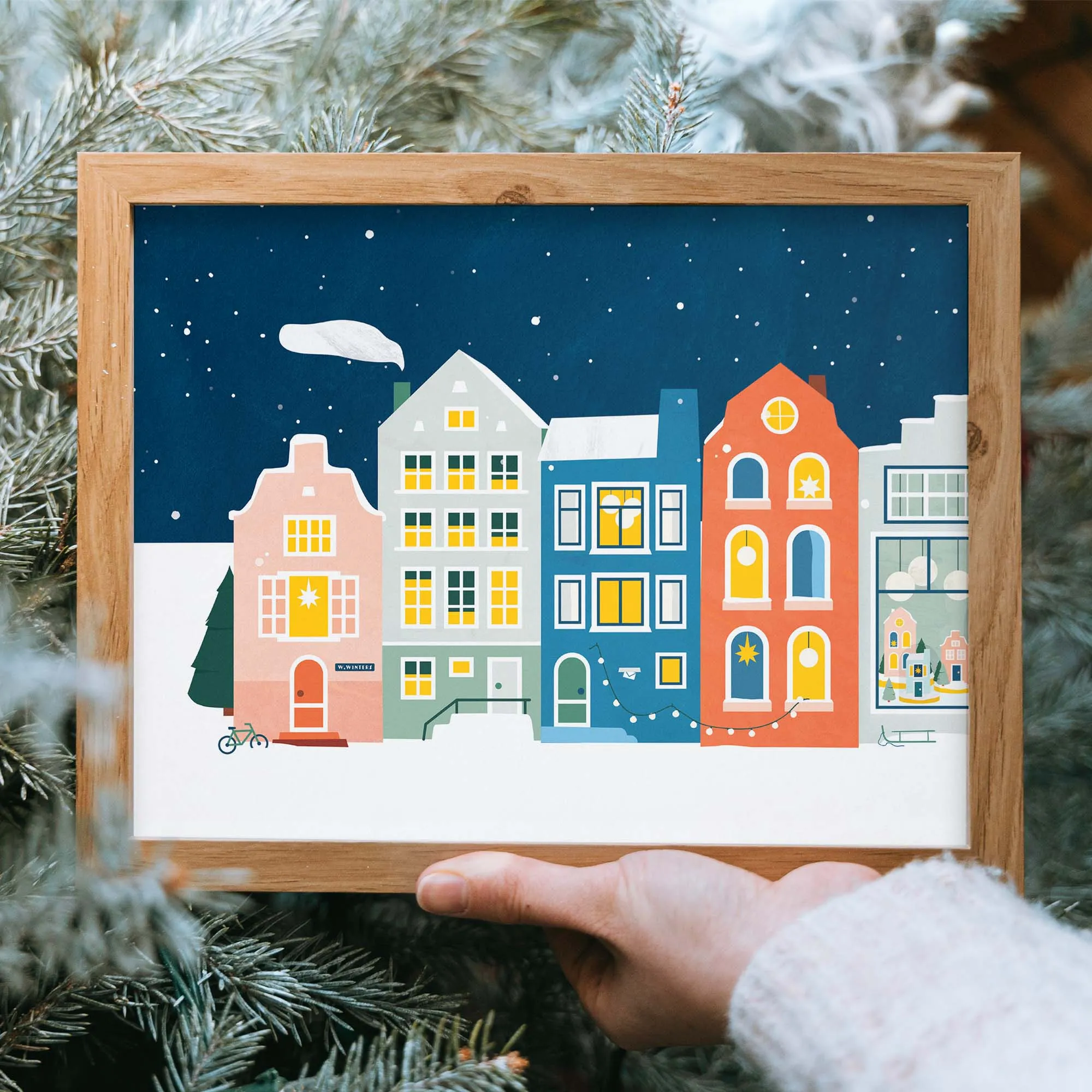 Dit kleurrijke winterse straatje is perfect om je huis op te vrolijken tijdens donkere winter dagen, of als wanddecoratie tijdens feestdagen zoals kerst en oud & nieuw.