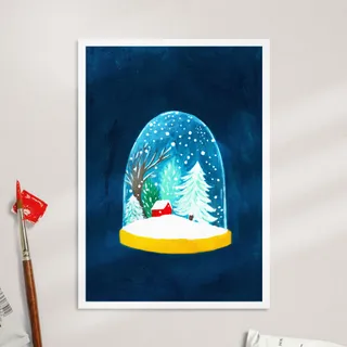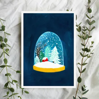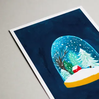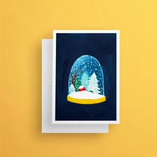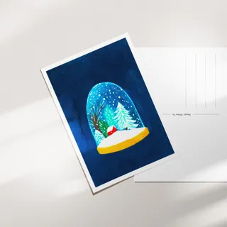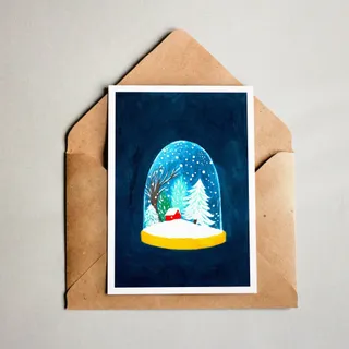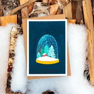 Een gezellige sneeuwbol kerstkaart met winters landschap, dennenbomen en een schattig rood huisje.